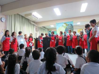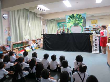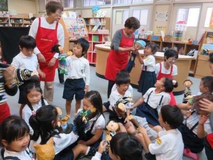 生野区更生保護女性会「くるみ座」の皆様に来ていただき、「おおきなかぶら」と「ないたあかおに」の指人形劇を楽しませていただきました。指人形の操作の仕方も体験させていただきました。初めてのわくわくな体験にみんな嬉しそうでした。また、観たいなぁ!!ありがとうございました
