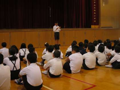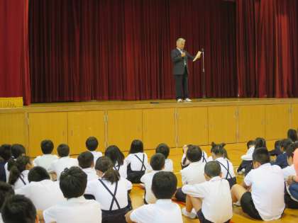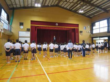 月曜日は休みが多く、1か月ぶりの児童朝会となりました。校長先生や、看護当番の先生のお話、委員会の発表など、話を聞く態度もよく落ち着いた1週間のスタートがきれました。