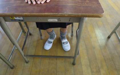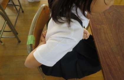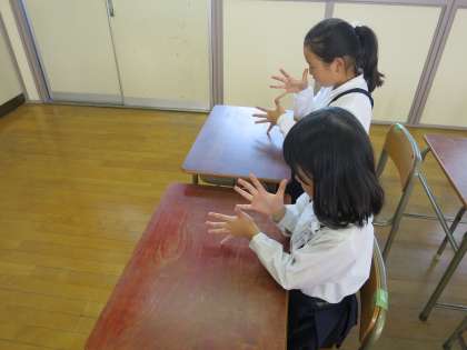 今月の生活目標「背すじピン グーチョキパーで よい姿勢」のグーチョキパー、意識するだけで姿勢がぐんとよくなりますよ。上からグーチョキパーです。