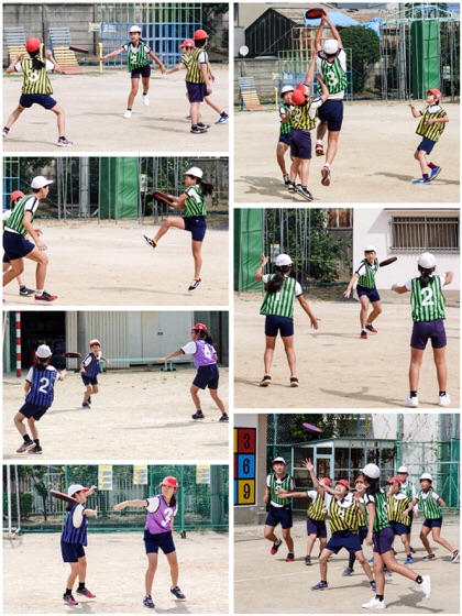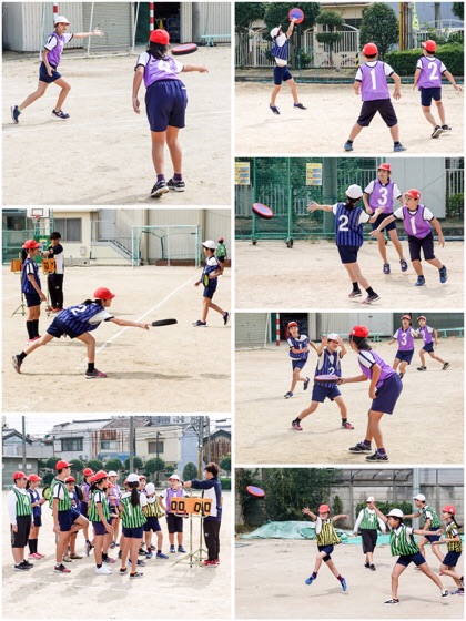 3時間目、運動場で体育の学習。新型スポーツ「アルティメット」に取り組んでいました。