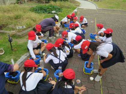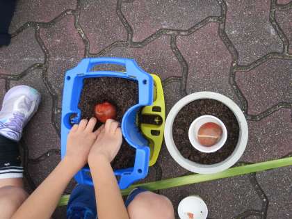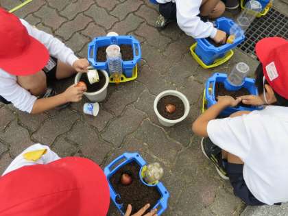 手でしっかり穴を掘って、チューリップの球根を植えました。「私のはピンク、私のは紫!」きれいに咲いているチューリップの花を想像しながら植えると楽しいね。