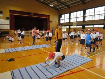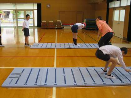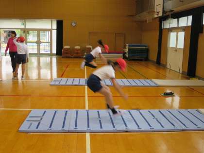 たてわり班で、立ち幅跳びの記録を測定しました。上下に大きく手を振ってジャンプ!1人2回記録をとりました。前回と比べて記録は伸びていたかな?