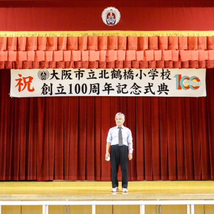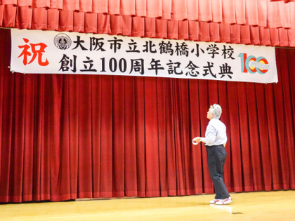 23日(火)、講堂の舞台上に100周年記念式典の横断幕が飾られました。