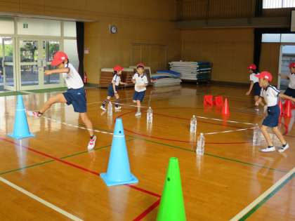 どうやってとんだら、とびっこ名人になれるかな?とんでみてわかったことを発表し、うまくとべるコツがわかったら、いろんなとび方で練習しました。「ドンマイ!」「ナイス!」うれしい応援も聞こえてきました。