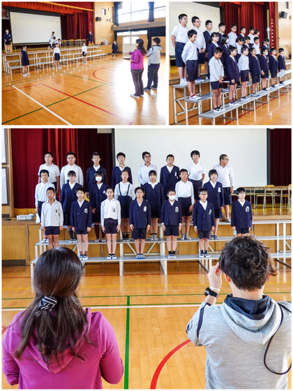 6年生は、5年生と合同で“よろこびのことば”を発表します。この時間は、5年生担任のK先生も合流。合同練習に向けて、6年生の動きを確認・記録していました。
