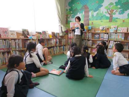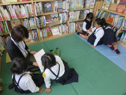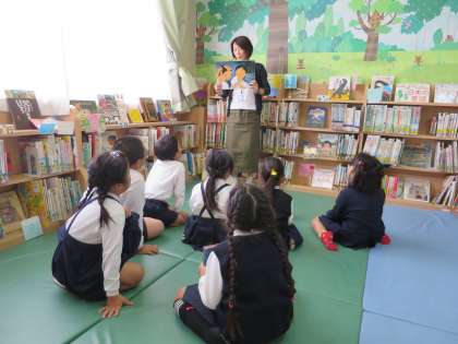 「お楽しみ会!お楽しみ会!」子どもたちが嬉しそうに図書室に入ってきました。紙芝居の読み聞かせが始まります。読み聞かせをしていただいた後も、先生と一緒に絵本を楽しんでいました。