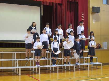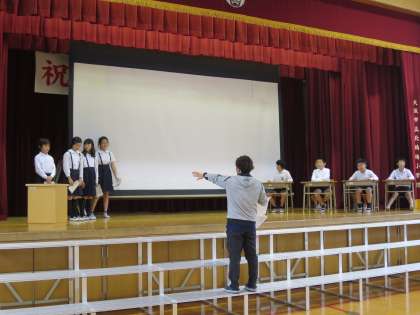 式典に向けて今日から講堂で練習を始めました。ナレーターや子ども役に分かれて練習です。完璧にセリフを覚えている子もたくさんいました。みんながんばって!!