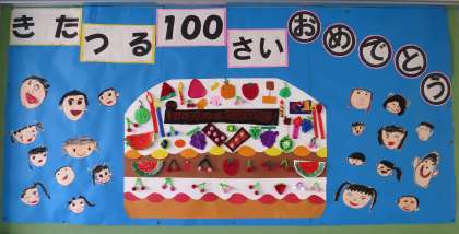 今日から11月です。11月といえば、いよいよ創立100周年記念式典です。正面玄関の掲示板には、1年生の作品が掲示されています。その下は、児童会の作品です。最後は先生方の作品です。どれもお祝いの気持ちが込められた素敵な作品です。