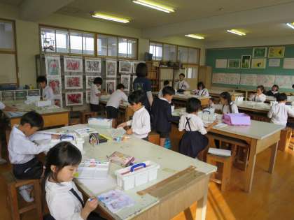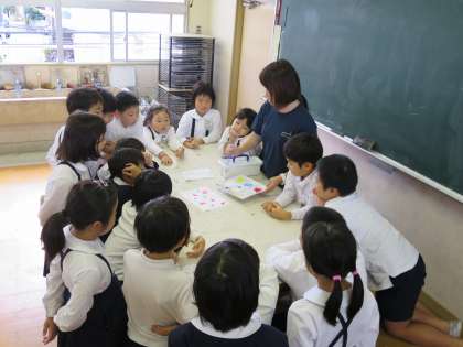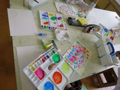 筆で水をたっぷりぬって、その上からお気に入りの絵の具を選んでポンポンぬっていくと、にじんできてとてもきれいです。先生のお手本を見せていただいた後、早速チャレンジ!それぞれにポンポンと、にじんだ絵の具を楽しんでいました。