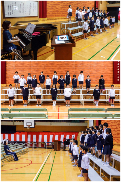 1時間目、講堂で“よろこびのことば”の練習をする2年生です。