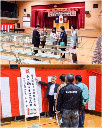 地域・教職員・PTAの代表で組織されている事業委員会。式典や祝賀会、記念誌、記念品など、100周年記念事業のあらゆることを議題にし、確認・決定する場でした。今回は、委員会後、式典会場である講堂に移動。準備が整いつつある講堂で、座席等の確認を行いました。