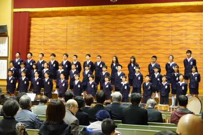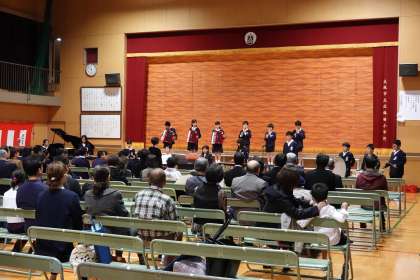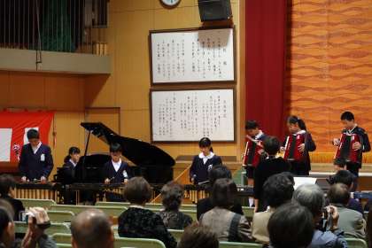 記念式典のオープニングは5年生「威風堂々」と6年生「情熱大陸」の合奏と5・6年生の歌「ふるさと」でスタートです。