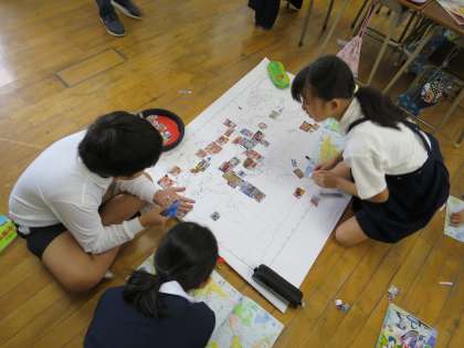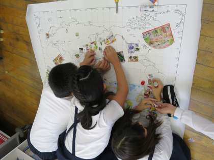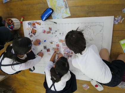 新聞に入っている食品の広告を切りぬいて、世界地図にはってみました。この食品はどこの国から来たのかな?産地をもとに地図にはっていくと、様々な国から食品を輸入していることがよくわかりました。