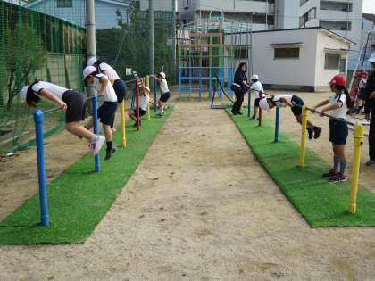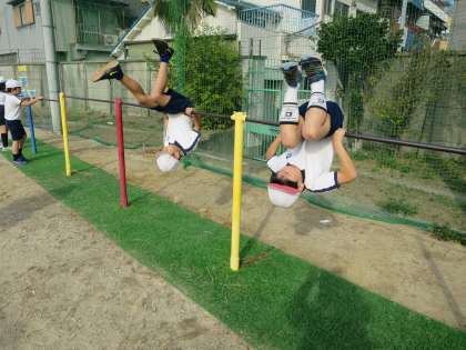 今日は、前回りや逆上がりに挑戦しました。先生に補助をしていただいたり、うまくできている児童の見本を見せてもらったりして、何度も何度もチャレンジしました。