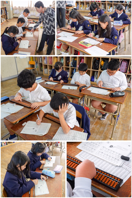 4時間目は、月イチのそろばん学習。3つの数の計算問題に取り組んでいました。“7−3+2”のような計算ですね。