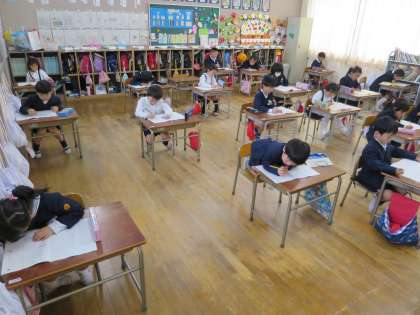 1・2年生は、国語と算数の標準学力調査を行いました。国語では、CDによる聞きとりテストもありました。冊子になった問題を読み返しながらがんばっていました。