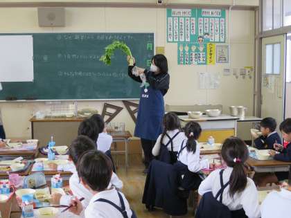今日の給食では、なにわ伝統野菜の「田辺だいこん」を使ったみそ汁や煮ものをいただきました。また、栄養教諭の先生から、田辺だいこんの立派な葉っぱを見せていただきました。火曜日に春の七草の学習をした2年生は、「すずしろの葉っぱや!」と学習したことを思い出したようです!
