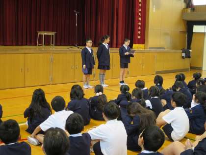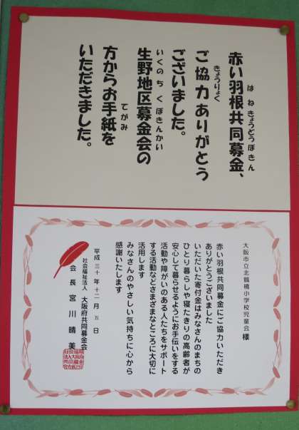 今朝の児童朝会で、赤い羽根共同募金で集まった募金を届けた「生野地区募金会」の方からのお礼のお手紙を、児童会の子どもたちが紹介してくれました。保護者の皆様、地域の皆様、たくさんの温かいご支援ありがとうございました。