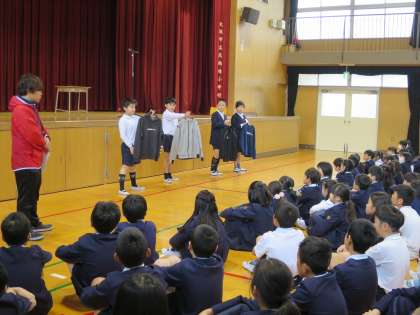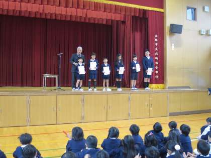 今朝は、火災予防の絵画コンクールと読書感想文コンクールで入賞した児童の表彰がありました。校長先生から表彰状が手渡されました。おめでとうございます。また、生活指導の先生から、冬季の体育時の服装についての説明がありました。本日お手紙を持ち帰っていますので、お子様とご確認ください。