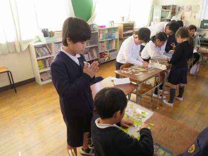 3年生と5年生の交流給食では、食後に5年生が作ったパズルで一緒にあそびました。