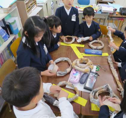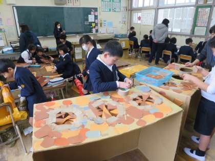 北鶴フェスティバルに向けて、たてわり班でゲームの製作をしました。身近にある材料をうまく使って、楽しいゲームになるように工夫がいっぱいです。