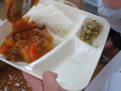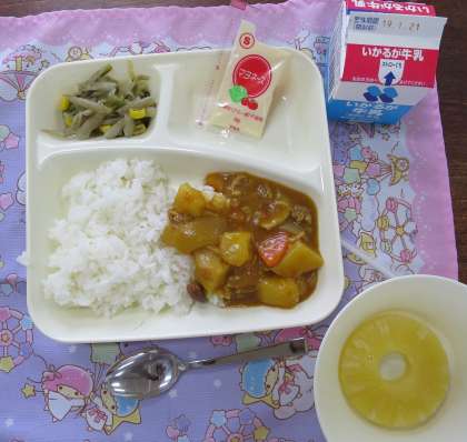 今日の給食には、豚肉と金時豆のカレーライスがでました。いろんなカレーライスがありますが、初めての献立です。鉄分と食物繊維が多い豆ですが、普段あまり食べる機会がないので、ぜひ取り入れて食べてほしいという意味があるそうです!ごちそうさまでした。