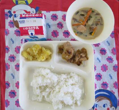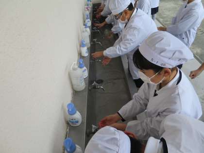 感染症予防には、まず手洗いが大切です。特に、給食前には手洗いの後に、手の消毒も行っています。子どもたちも手洗いに対する意識が高いようで、手の洗い方が上手です。さて、今日の給食には正月献立の「くりきんとん」がでました。ほっこり甘くておいしかったです。ごちそうさまでした。