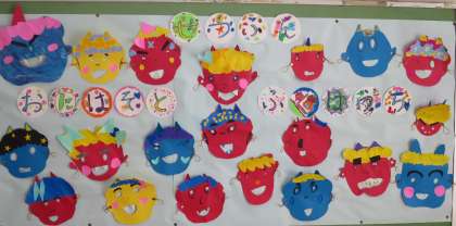 階段掲示の「おにのお面」がとてもかわいくて!!青おに赤おに黄おに・・・表情も、みんなそれぞれ違っていて素敵です。
