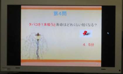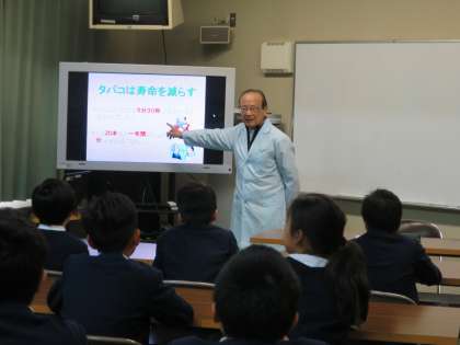 学校薬剤師の先生に来ていただいて、主に、たばこの害について教えていただきました。将来の自分の姿も考えながらの大切なお話になりました。ありがとうございました。
