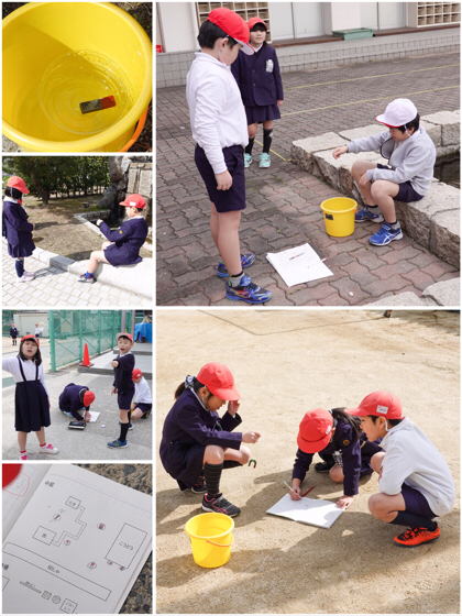 子どもたちの手には、棒磁石や方位じしん。グループごとで、棒磁石や方位じしんがどちらの方向を向くか調べているようです。棒磁石は、糸でつるしたり水に浮かべたりして、自由に動くようにしていました。中庭や講堂前、給食室前、運動場…いろいろな場所で調べ、記録していました。
