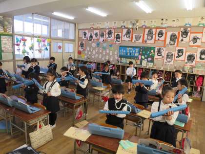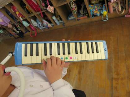 「こいぬのマーチ」のけんばんハーモニカを練習してきたので、今日は、けんばんハーモニカを手に持って吹いたり、立って吹いたりすることに挑戦しました。曲の最後まで手で持つと、なかなか重くて・・・。でも立って吹いてみたくて!がんばってます♪