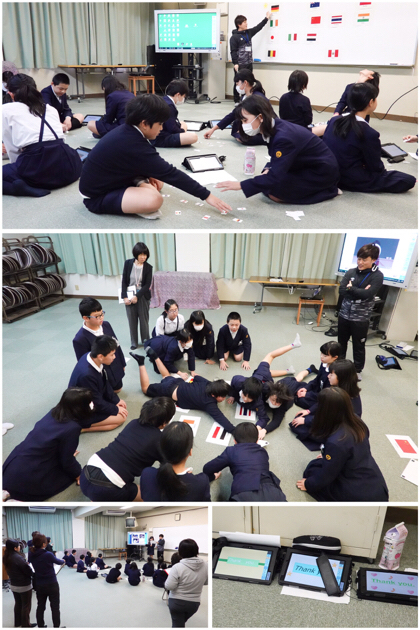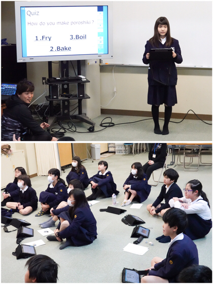 発表者は、タブレット端末を片手に、みんなに語りかけます。電子黒板には、プレゼン資料が映し出されていました。説明を聞いてどよめいたり、写真を見て驚いたり、クイズに答えたり。中には、流暢な英語を披露する子もいて、大変盛り上がりました。