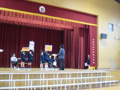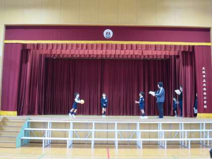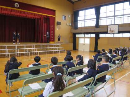 今日から、入学式で発表する新1年生に向けてのお祝いの練習が始まりました。たくさんの小道具を手に、講堂で練習です。みんなやる気満点の気持ちが伝わってきました!