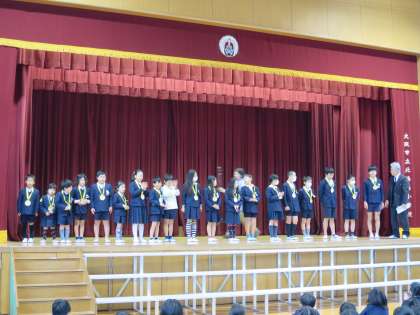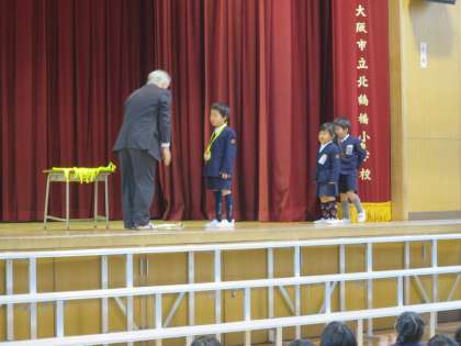 1年間を通して図書開放にたくさん参加した各学年トップ3の児童が、1年生から順番に表彰され、校長先生からメダルをいただきました。おめでとうございます。