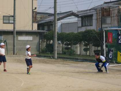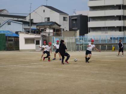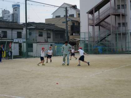 屋外スポーツクラブでは、教職員も加わってサッカーをしました。子どもたちの中に大人が3人入ると、迫力満点です。また一ついい思い出ができたね!