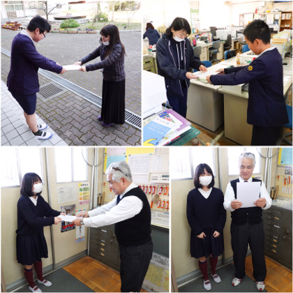 休み時間に、先生をたずねて職員室に来る6年生。先生方に手紙を届けに来たのです。管理作業員室や給食室に行く子もいました。