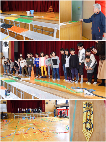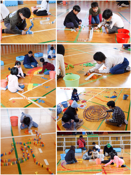 チームに分かれて、持ち場にドミノをならべます。倒してしまったときのストッパーを各所に配置して、細心の注意を払いながら慎重にならべていきます。倒れ方を想像しながら…。保護者のみなさんや青少年指導員のみなさんも参加して、もう総力戦です!