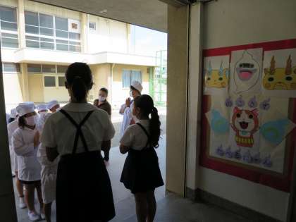 今日から2学期の給食が開始されました。今日の献立は何かな??とうれしそうに献立のサンプル棚を見ていました。みんなおいしい給食が大好きです。