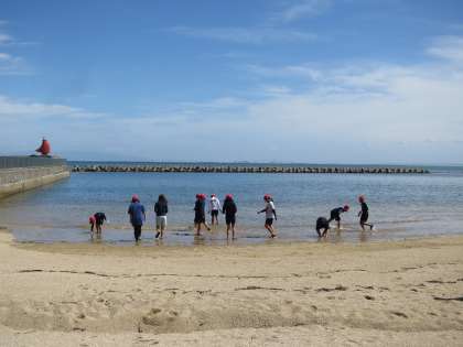 ビーチを散策しました。貝殻を集めたり、膝あたりまで海に入って水遊びを楽しみました。
