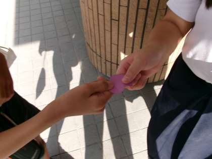 元気にあいさつをしてくれた児童に、ハートのカードを配ります。