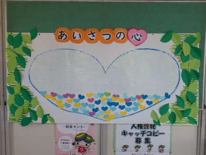 職員室前の掲示板にある大きな「あいさつの心」にカードを貼って、あいさつの心をいっぱいにしましょう!