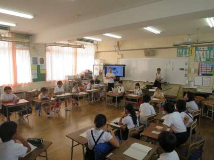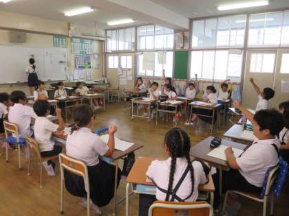 学級会で、お楽しみ会のめあてを何にするかを話し合いました。司会、記録、書記、時間それぞれの係を決めて話し合います。初めての話し合い!話し合いのルールを大切にしながらみんなで意見を出し合いました。