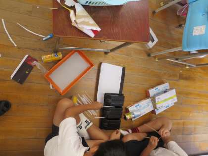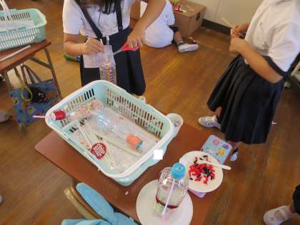 動くおもちゃ、きらきら光るおもちゃ、音が鳴るおもちゃなど、オリジナルのおもちゃを作って、完成したら1年生を招待します。工夫に工夫を重ねて、素敵なおもちゃができあがってきました。