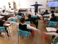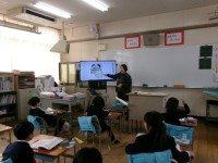 筆箱の中に入っている文房具の名前について学習していました。みんなに馴染みのあるキャラクターの筆箱の中身を「Do you have・・・」を使って英語で質問していきました。
