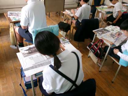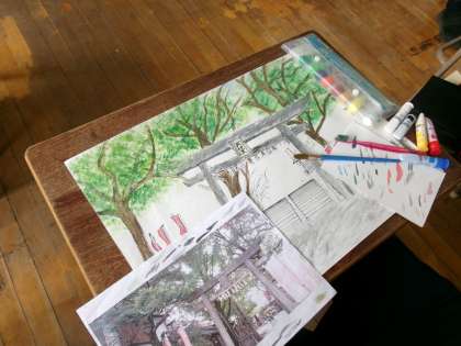 御幸森神社で撮った写真を見ながら、正面から見た鳥居や、少し下から見た本殿、狛犬など、自分のお気に入りの場所の絵を描いていました。