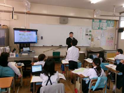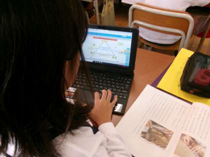 子どもたちは、文章の大事な部分に線を引き、タブレットを使ってピラミッド型のワークシートに書き込んでいきます。ワークシートをもとに、短く要約した文章をみんなで発表することができました。