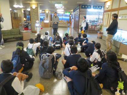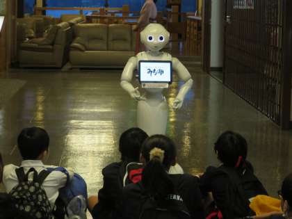賢島駅から旅館「みち潮」さんまでは、歩いて向かいました。到着後、開舎式を行いました。宿舎の方に加えて、ペッパー君も挨拶をしてくれました。