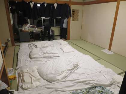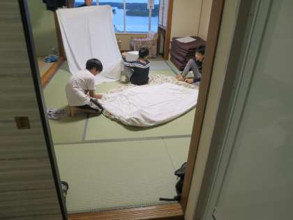一日の反省をして、就寝準備です。布団は自分たちで準備します。友達と協力してシーツを敷きました。おやすみなさい。