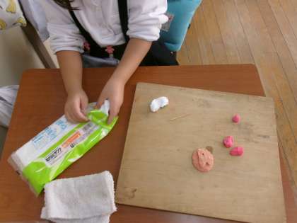 粘土に好きな色の絵の具を混ぜてこねていきます。