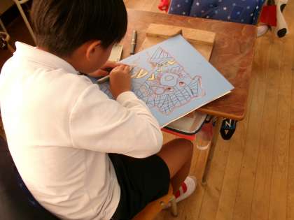 彫る部分と残す部分をペンで下書きしたあと、彫刻刀で線彫りを始めました。